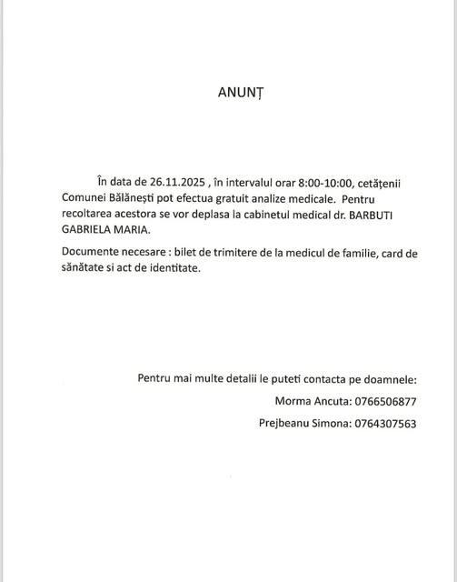 În data de 26 noiembrie 2025, între orele 8:00 și 10:00, locuitorii sunt așteptați la cabinetul medical al doctoriței Gabriela Maria Bărbuți , unde vor fi recoltate probe pentru analize medicale.