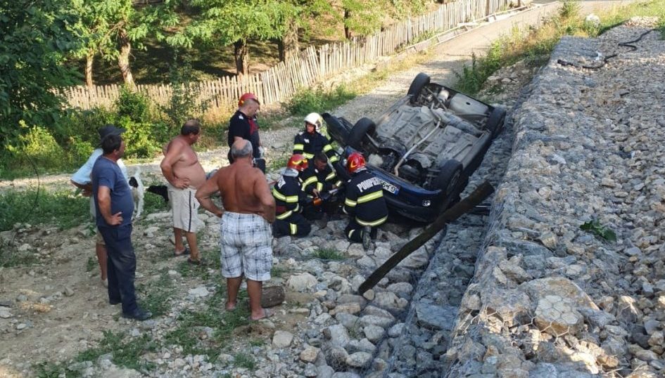 Accident cu victime la Tismana. O mașină a căzut de la o înălțime de 2 metri și a aterizat pe plafon.