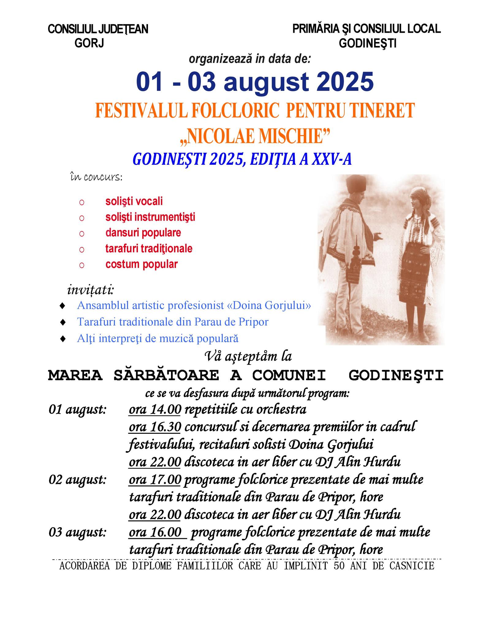 În perioada 1–3 august, comuna Godinești găzduiește cea de-a XXV-a ediție a Festivalului Folcloric pentru Tineret „Nicolae Mischie”. Evenimentul se desfășoară în Grindul Godineștiului și aduce în prim-plan tradițiile autentice ale zonei.