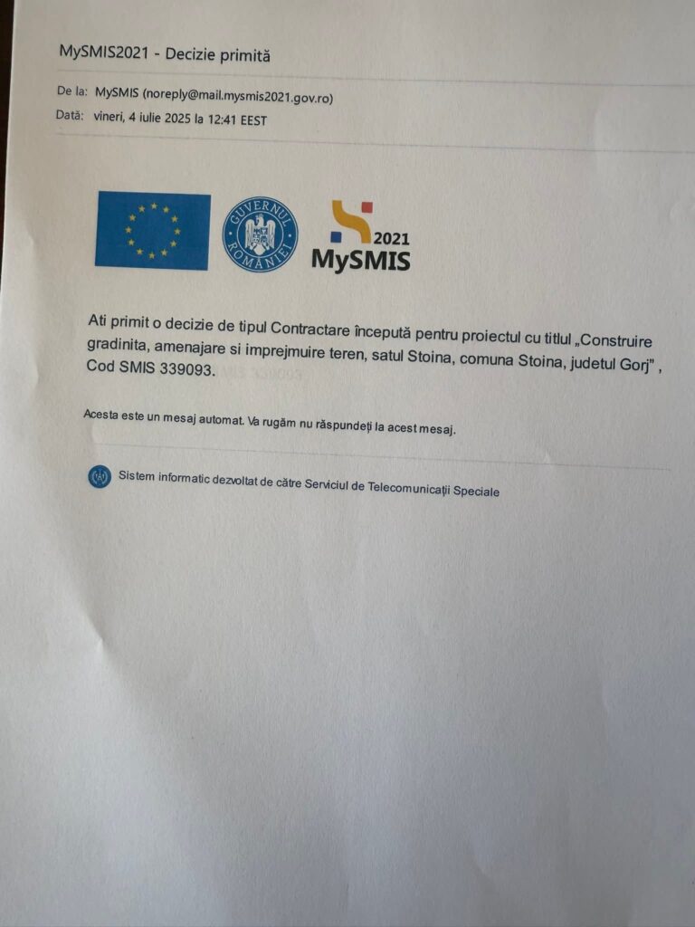 O nouă grădiniță va fi construită în comuna gorjeană Stoina, după ce proiectul a fost aprobat pentru finanțare și contractare. Anunțul a fost făcut de primarul Marian Fota, care a subliniat că este o reușită importantă pentru viitorul educației în localitate.