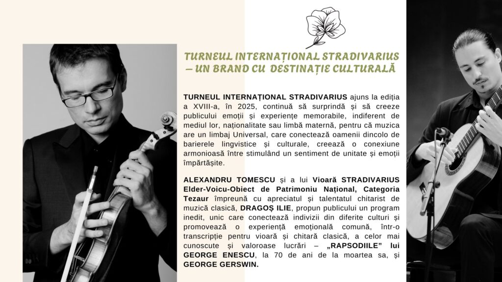Evenimentul culminează cu un recital extraordinar susținut de violonistul Alexandru Tomescu, în cadrul Turneului Național Stradivarius – Rapsodiile. Sunetul unic al viorii Stradivarius va răsuna în aerul nopții, acompaniat de chitară clasică, într-un decor feeric de instalații florale și lumini magice.