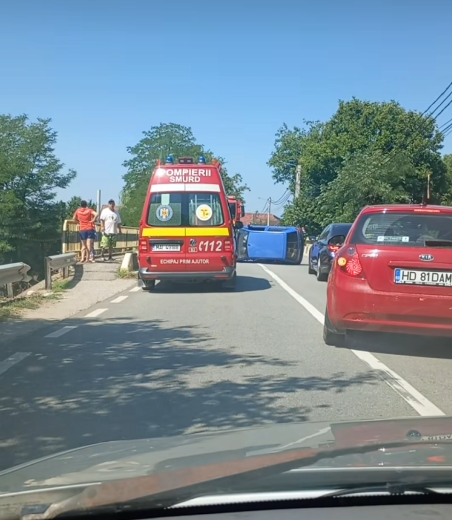 Accident spectaculos, luni dimineață, la Peștișani. Un autoturism s-a răsturnat în zona podului din localitate.