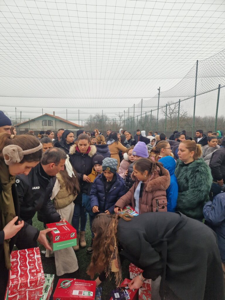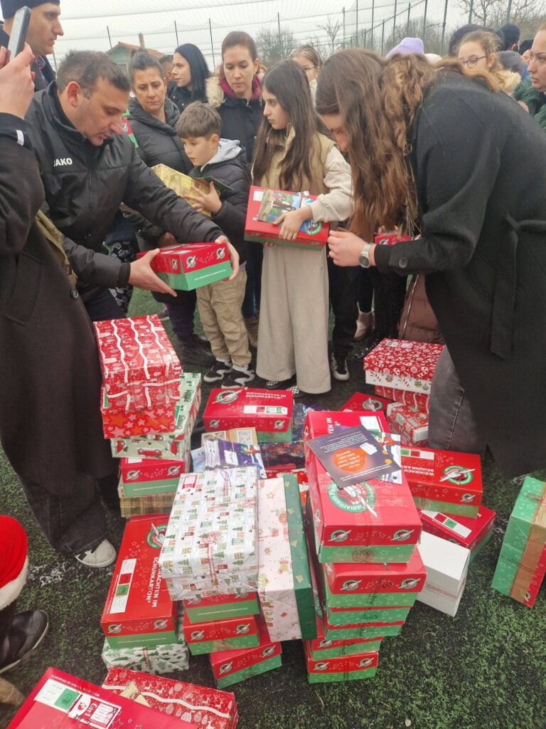 Pe terenul sintetic de sport, peste 170 de copii l-au întâmpinat pe Moș Crăciun, care a sosit cu daruri pentru fiecare dintre ei.