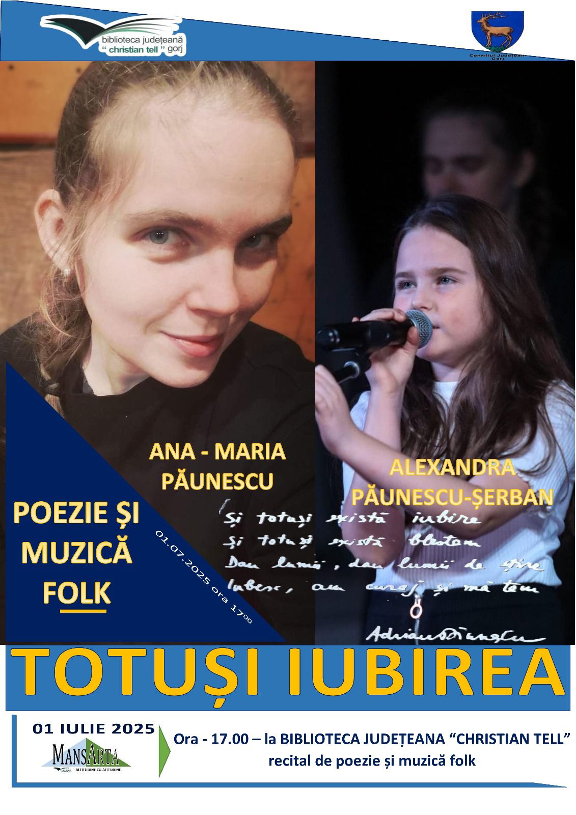 Organizat cu sprijinul Consiliului Județean Gorj, recitalul aduce împreună generații diferite, unite prin forța cuvântului și a muzicii sincere.